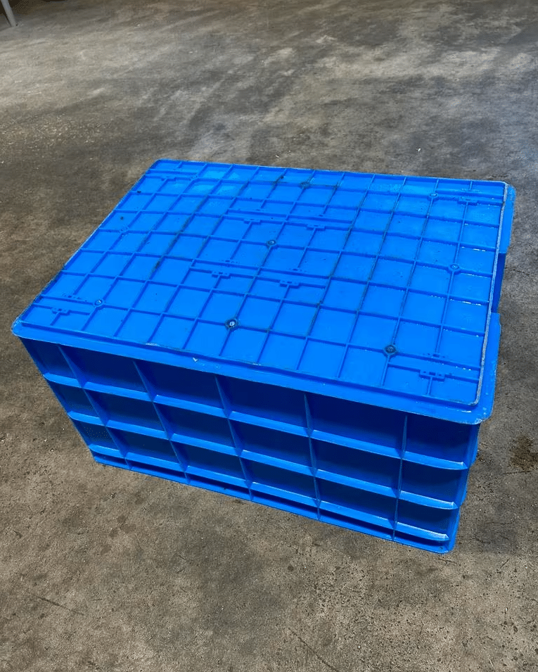 Gebruikte dichte kunststof bakken van 85x62x45 cm. Deze blauwe plastic kratten zijn in goede staat.